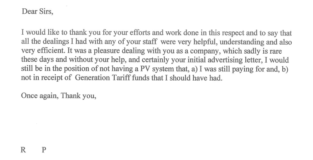 I would like to thank you for your efforts and work done in this respect and to say that all the dealing I had with any of your staff were very helpful, understanding and also very efficient. It was a pleasure dealing with you as a company, which sadly is rare these days and without your help, and certainly your initial advertising letter, I would still be in the position of not having a PV system that, a) I was still paying for and, b) not in receipt of Generation Tariff funds that I should have had.
